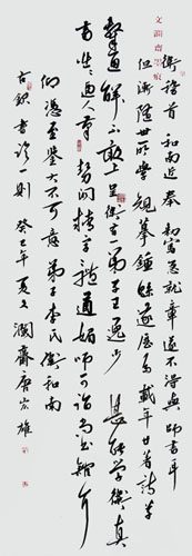 自幼喜爱书法,从小临帖,早早就打下了扎实的楷书基础。后来他下功夫练过“二王”“二王”兼具法度和灵妙的经典模样,确保了其书法的纯良趣味。初具规模之后,他又学过米芾,于温润冲淡之中加进了一些凌厉和华美。他研习过苏东坡、黄山谷、王铎、赵之谦等大家,不知不觉地将自己的书法渐渐引入一个深广汪洋的境界。正如瀑布之来,贵在水源之宽,蓄力之强。从四十岁到五十岁之间,是他书法广取博收、推波助澜、走向成熟、蔚然成家的关键时期。统而观之,有一条脉络是十分清晰的:他始终在不变中求变,变化之中又严守一些基本的元素不变,如雄厚、纯良、自然、质朴。如今,宏雄书法的内在功底和整体水平已经殊为可观,放在当代中国书坛的大环境里,也毫不逊色。