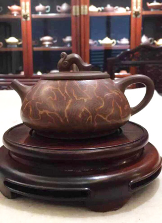 宜兴有天土,吴门出陶人。继陶瓷、紫砂已成国艺。一盈把握,诸子尽在一掬之间,上兑庄老之露、下泡儒佛之泉。禅意不看红尘事,一捧紫砂释天机。