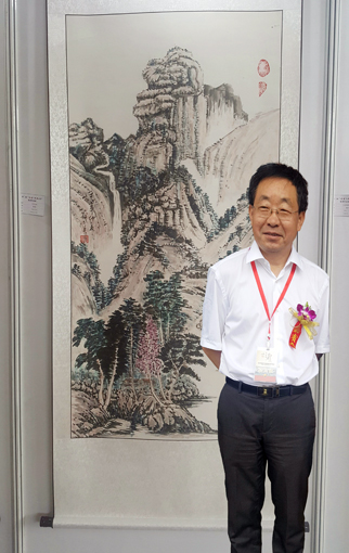 第二届“古建与书画之美”作品展活动中中国民族建筑研究会会长、国家民委计划财务司司长李春林在杨书英老师作品前留影
