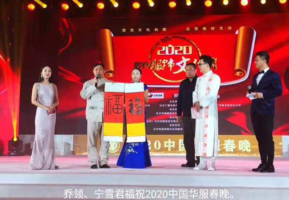 而今,庚子新春来临之际, “2020中国华服春晚”在北京饭店金色大厅隆重举办。这是为积极响应党中央提出的“创造人民美好生活”的时代号召,进一步弘扬时代精神,推动中华传统文化的传承和发展而开启的。本次活动以服装服饰为载体,通过各种形式展示人民良好的精神面貌、文化素养和文艺风采,丰富群众艺术文化生活,切实增强人民群众的获得感、幸福感。在开幕式上,乔领、宁雪君以及他们的中华国礼福字书法,应邀登上舞台,将传统与时尚相融合,将民族性与世界性相统一,在弘扬中华民族文化精粹,彰显中华民族文化自信中,展现新时代人民群众的新风采、新面貌和新祝福。