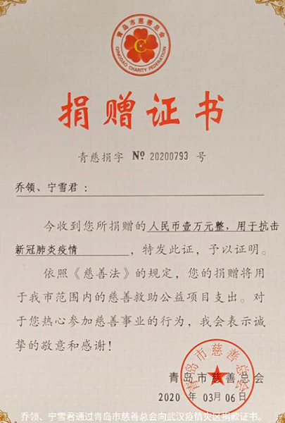 最后,在接受青岛电视台和半岛都市报等相关媒体采访时,乔领和宁雪君表示,中华儿女一家亲,武汉疫情的状况时刻牵动着我们的心。在这个特殊时期,乔领、宁雪君艺术馆全体同仁和青岛领航高尔夫球运动俱乐部、青岛市市北区庭义社会工作服务社等众多爱心人士以自己的绵薄之力,向战斗在一线的广大医护人员和战士们献礼致敬!我们将再接再厉不断地努力,不断创作,不断与各位有志之士献身使命,关爱社会。我们祈福伟大祖国,我们助力武汉加油。我们祈愿天下康宁,祖国泰和,武汉无恙,四海平安。这,就是我们当下最祈盼的福。