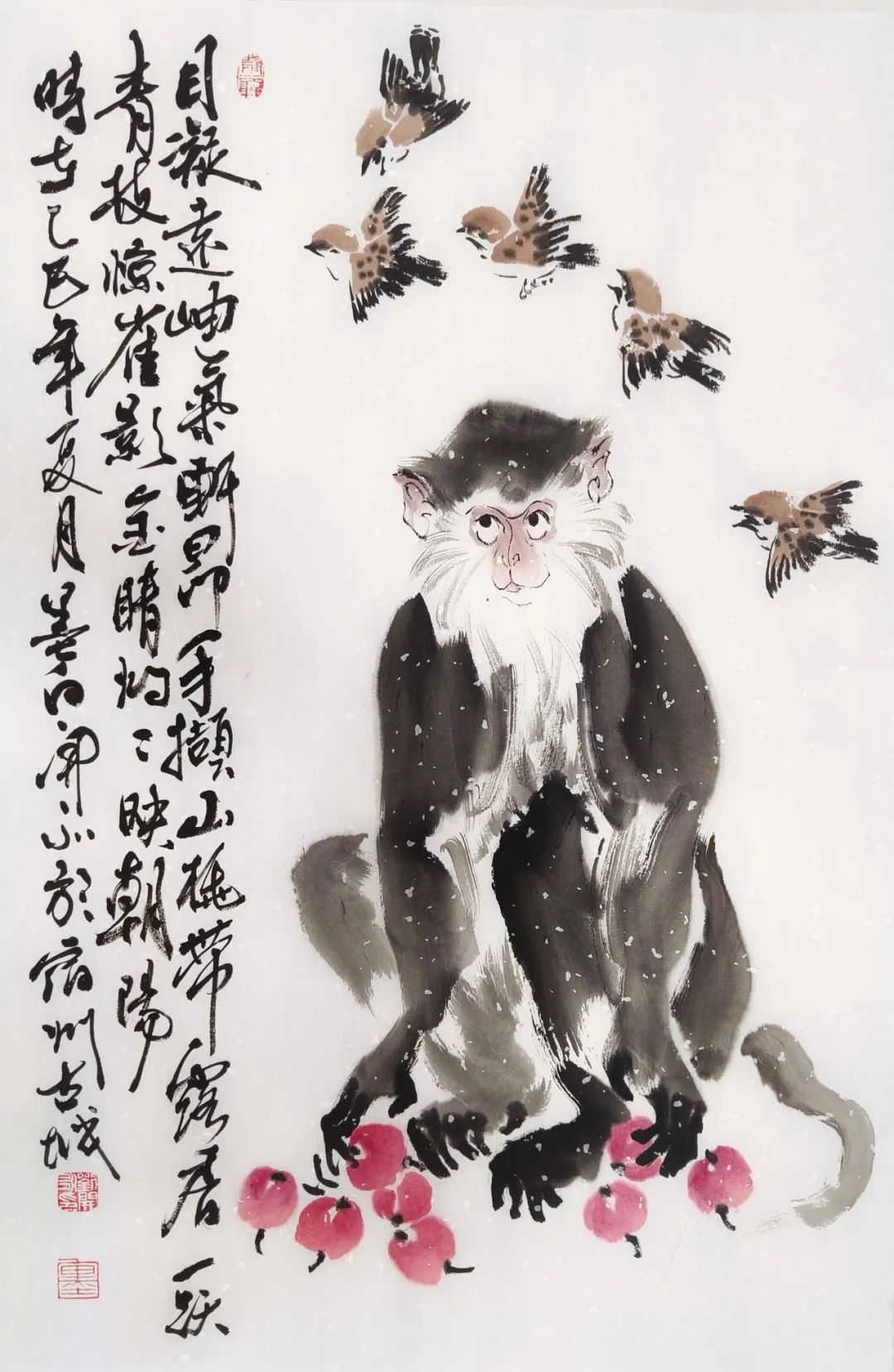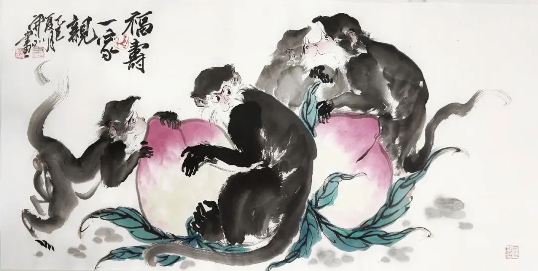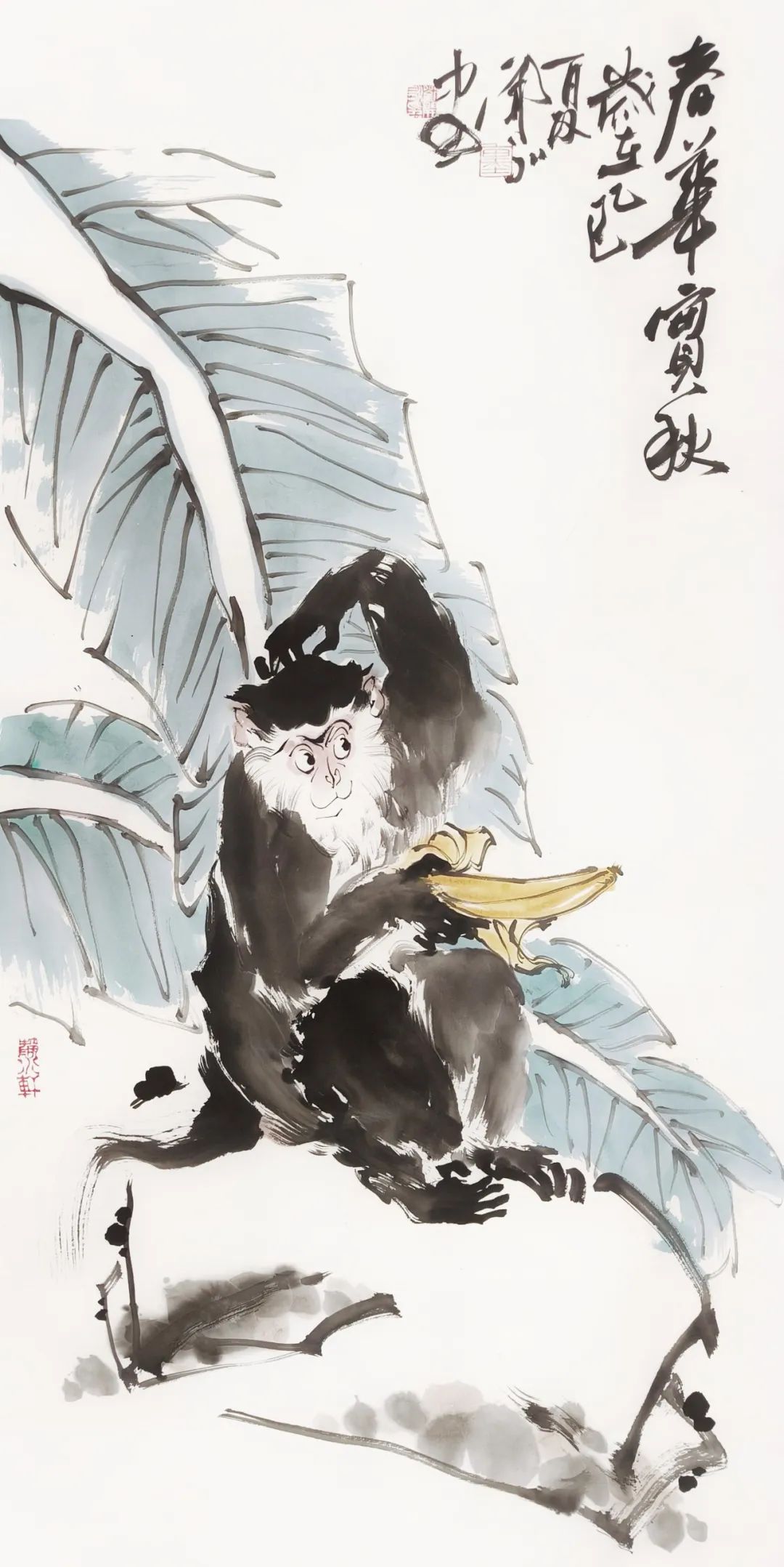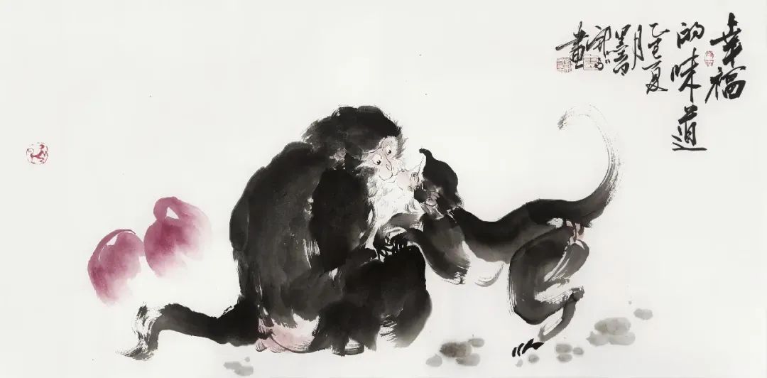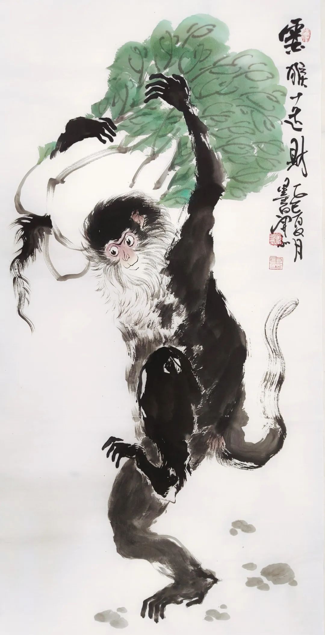 猴画艺术需要继承中国传统画风,同时吸收当代绘画的新观念。通过笔画、结构、用色、章法的多变,突出刚柔、虚实、浓淡等韵律变化,使作品兼具传统底蕴与时代审美。例如,我的创作注重将猴子从“自然表象”升华为“意象”,融入人情味与精神追求。