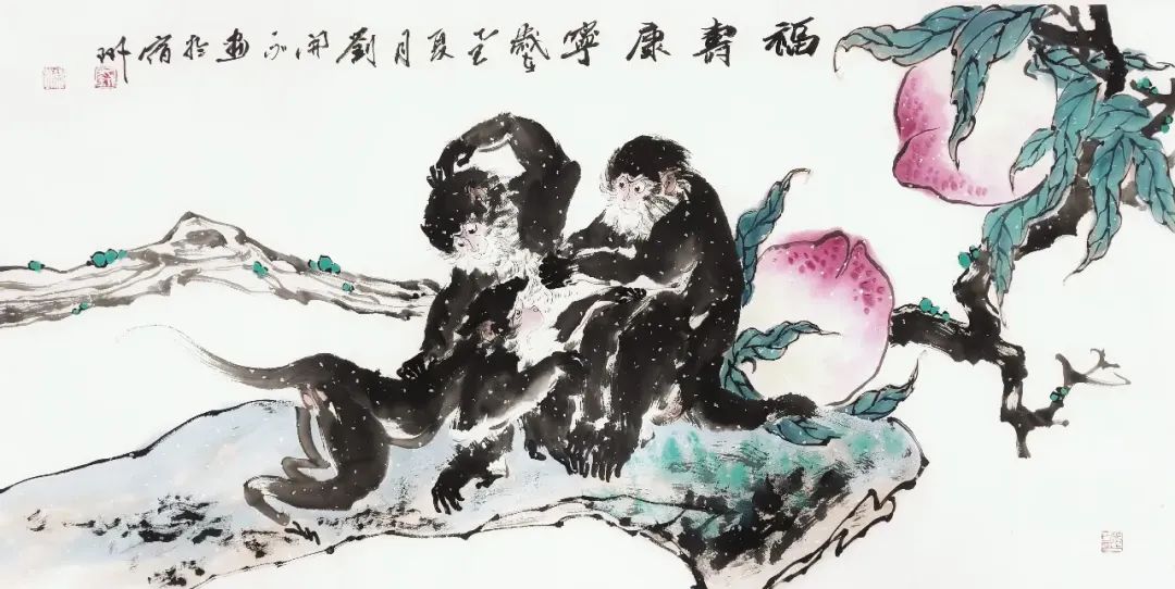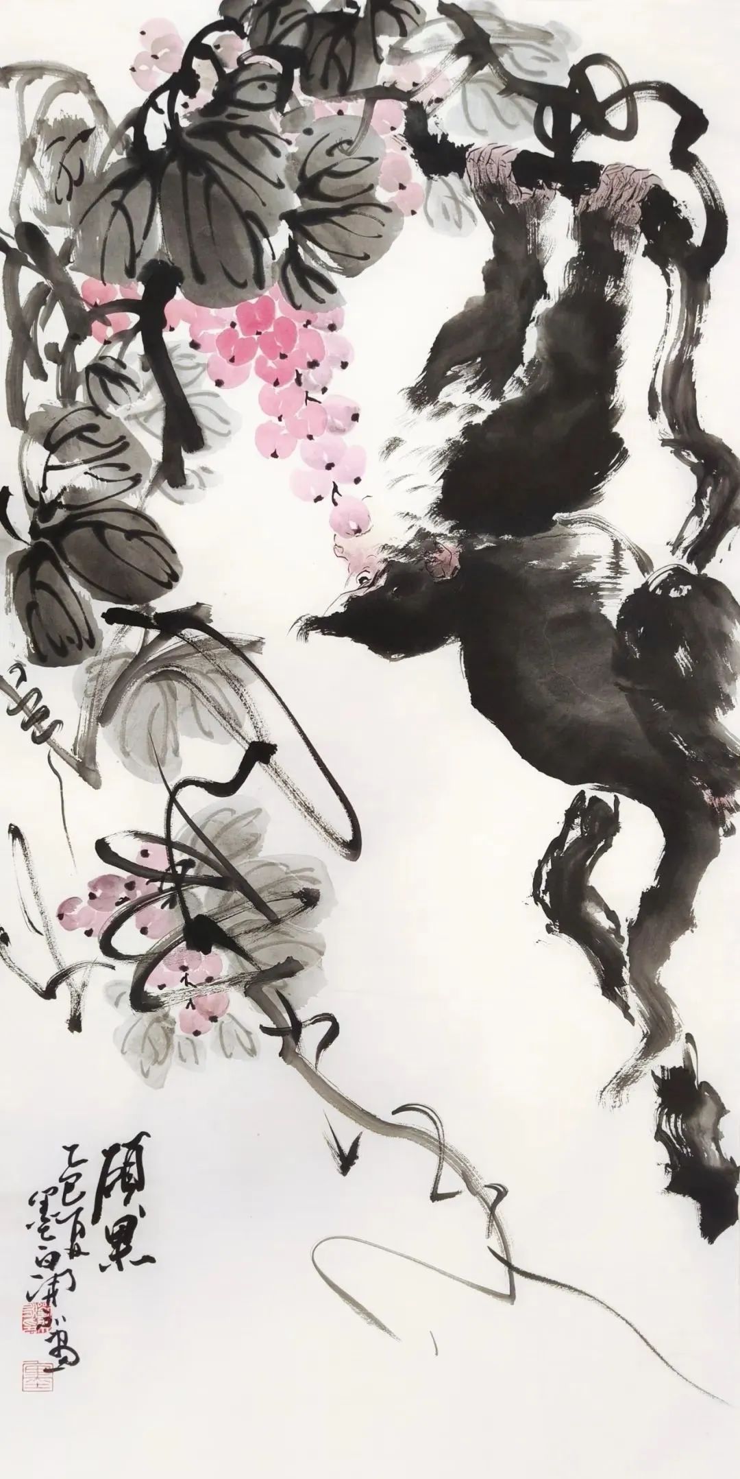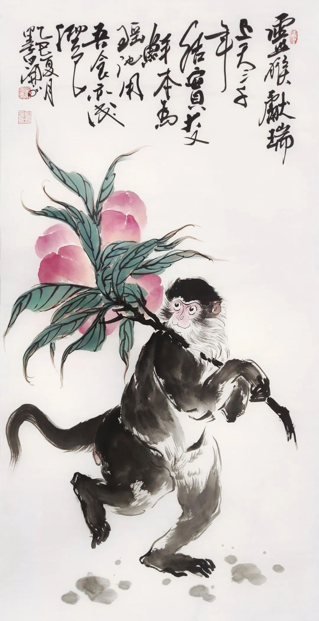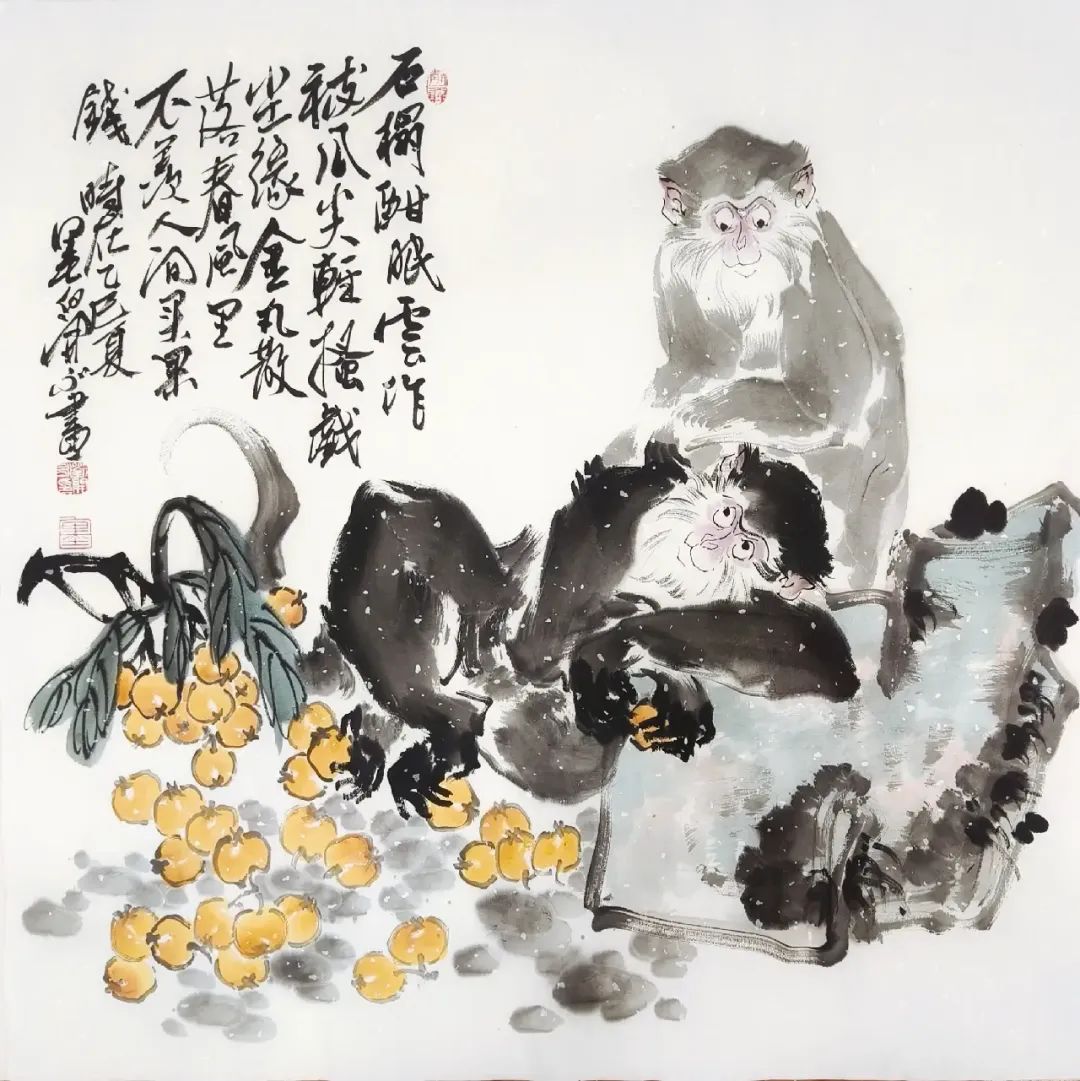 猴画艺术需要继承中国传统画风,同时吸收当代绘画的新观念。通过笔画、结构、用色、章法的多变,突出刚柔、虚实、浓淡等韵律变化,使作品兼具传统底蕴与时代审美。例如,我的创作注重将猴子从“自然表象”升华为“意象”,融入人情味与精神追求。