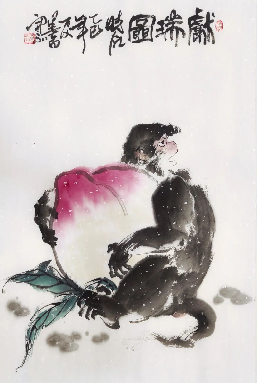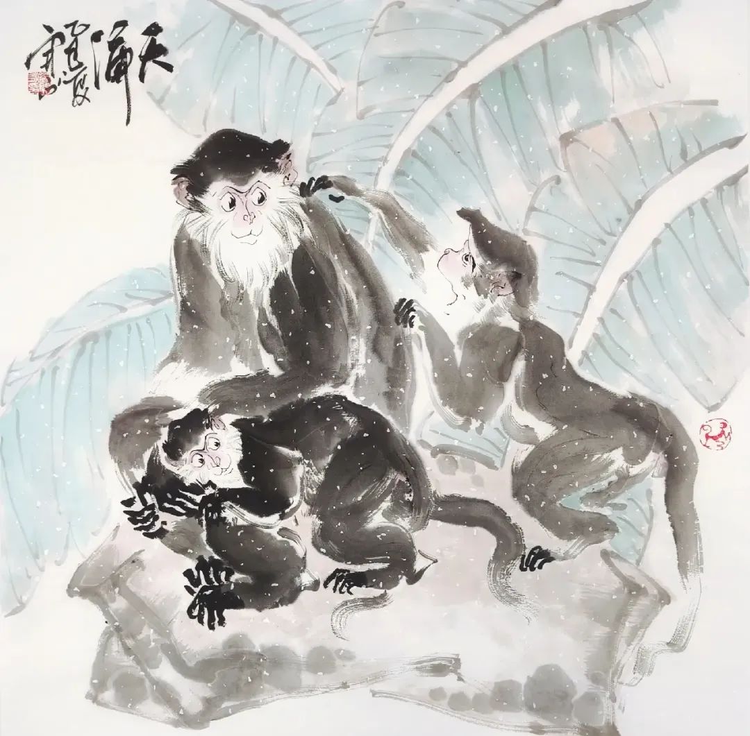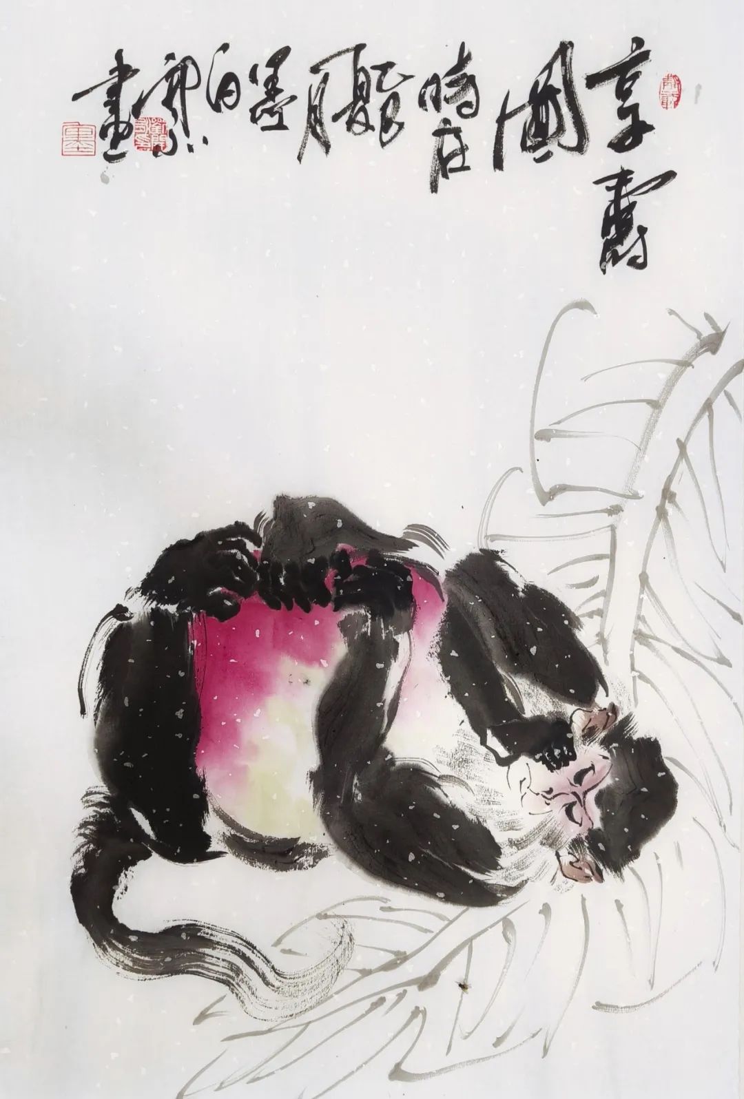 传统写意的"以形写神"理念,使猴画超越单纯生物摹写,成为承载东方哲学观照的载体。如李涵以大写意笔法表现猴群长幼有序的温情场景,正是将儒家伦理融入自然生灵的典范。