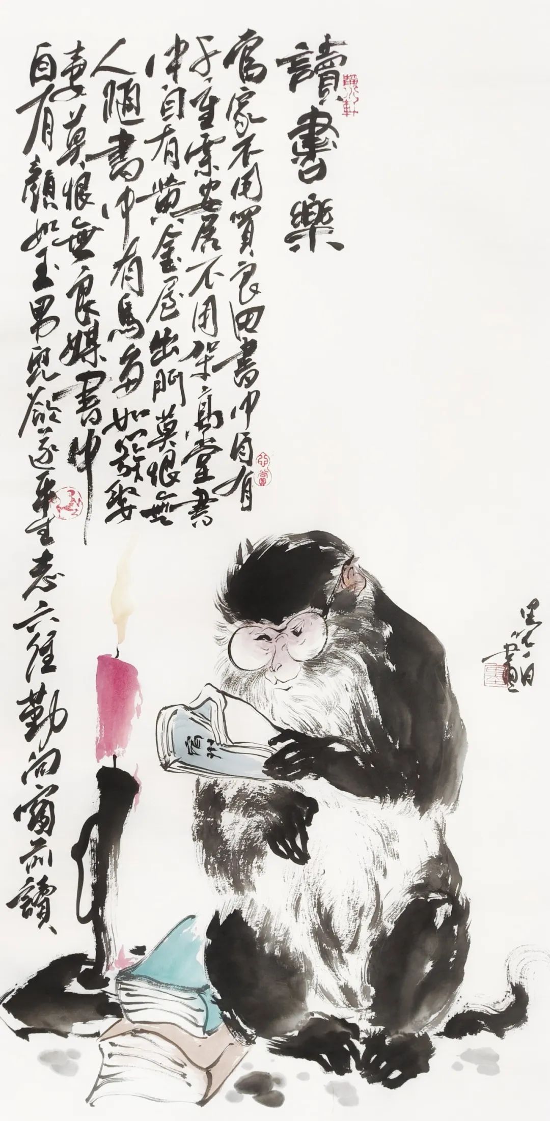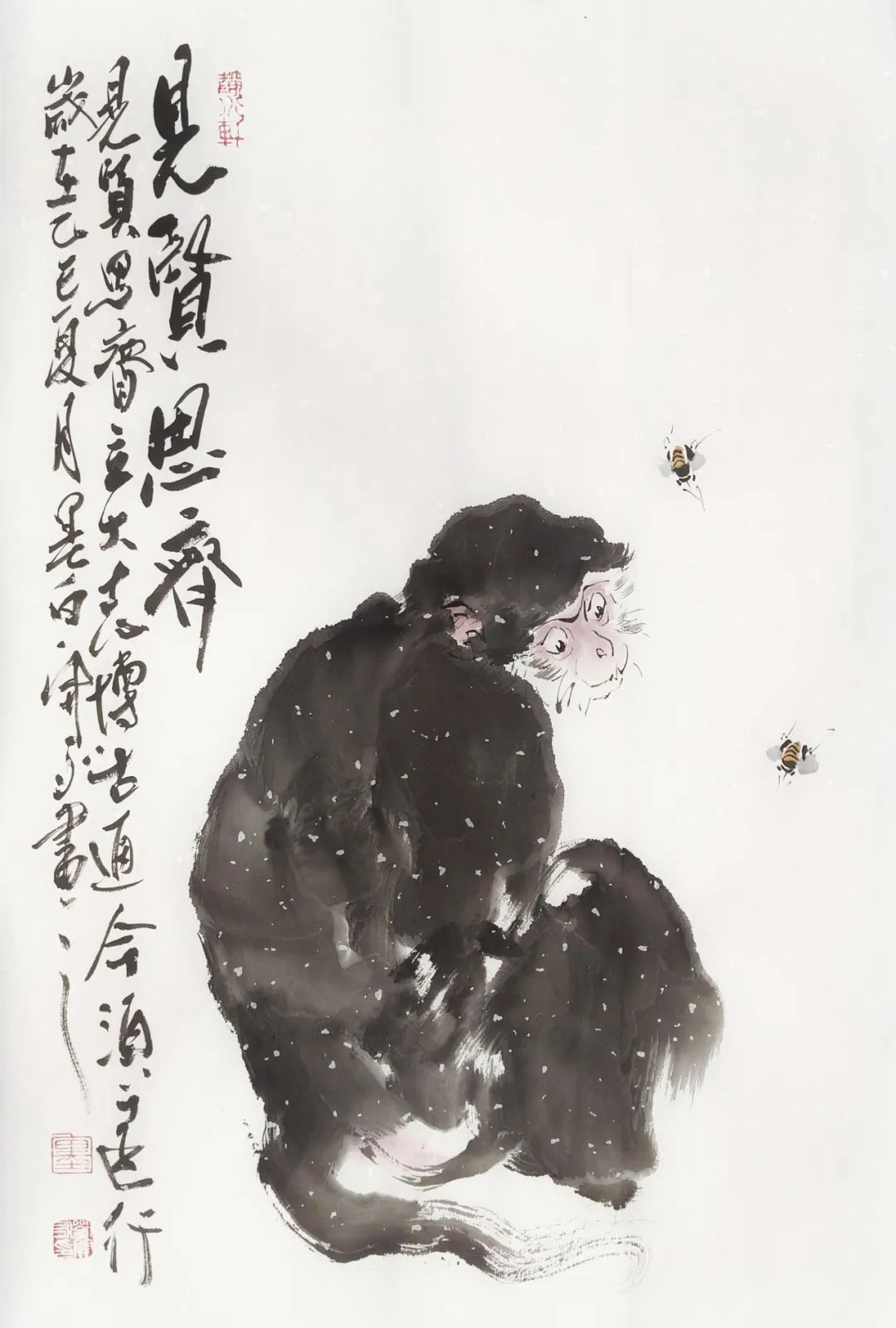 系统研习中国古代画论,从谢赫"六法"中悟得"气韵生动"的要义,将文人画的写意精神融入猴的创作。