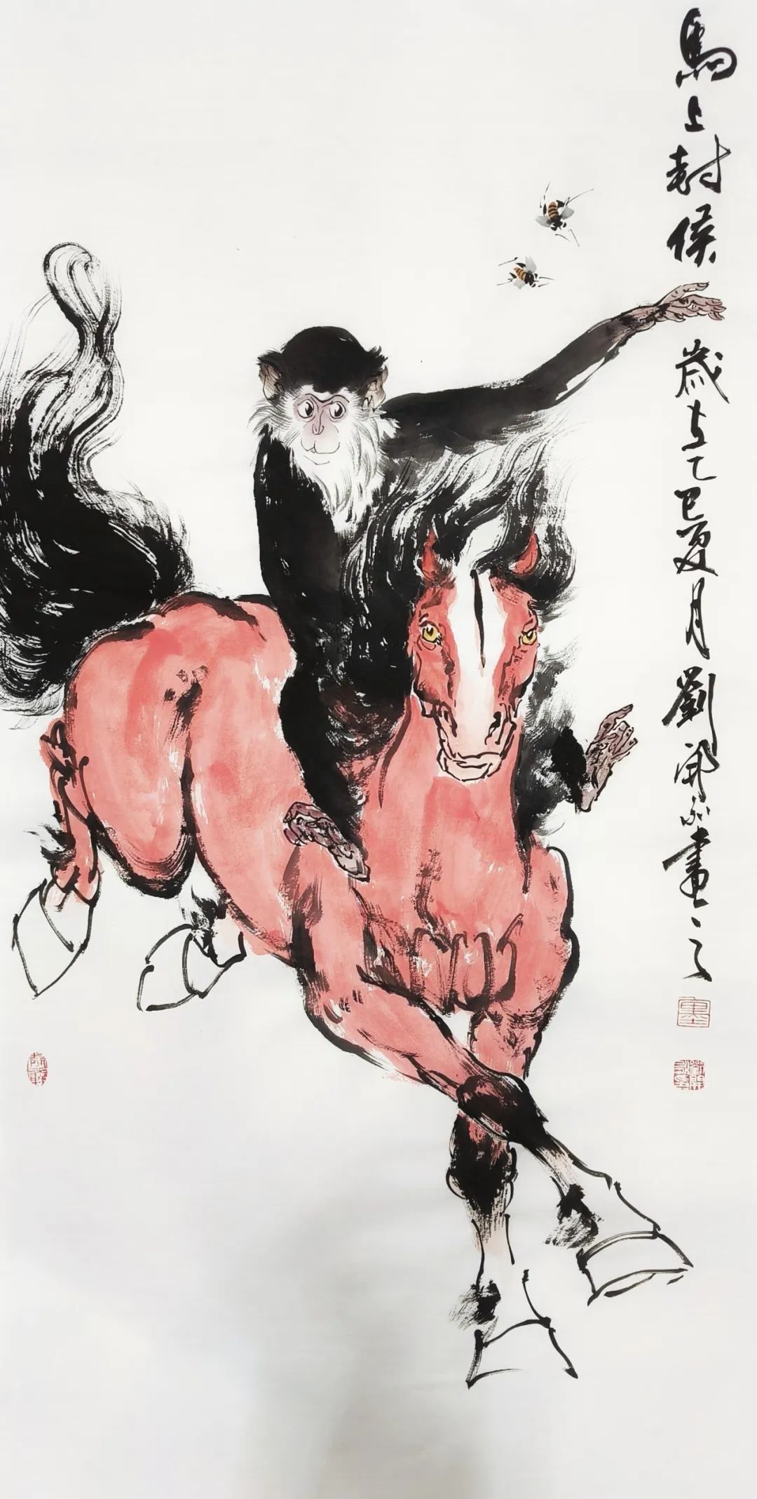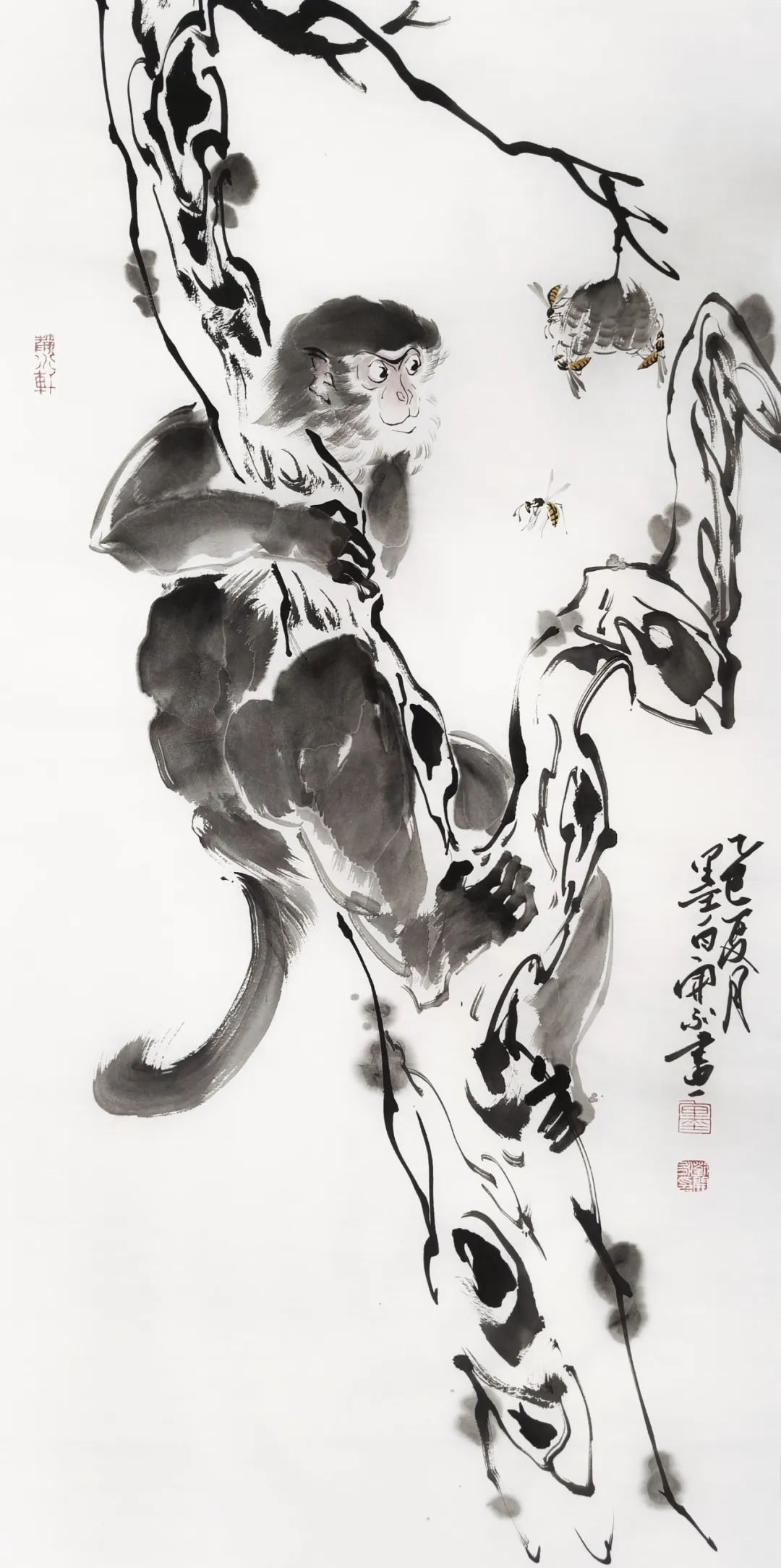 在清华美院的花鸟画高研班学习中,我接触到更多元的中西艺术理论。通过将西方光影处理与色彩构成技法融入传统水墨,我的猴画从单一形态刻画转向更丰富的动态捕捉与情感表达。例如《加官封侯》系列中,通过浓淡墨色的层叠渲染,既保留了传统写意的神韵,又增强了画面的现代视觉张力。此外,作为助教的教学经历,也促使我在创作中更注重技法传承与创新平衡,形成“古意新解”的独特风格。